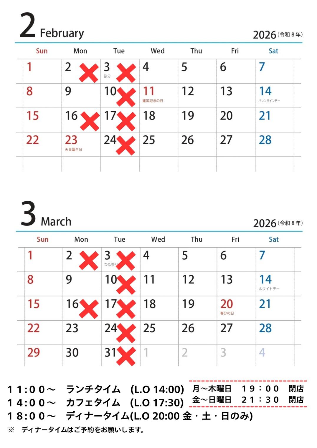 | 営業時間: | 【2026年1月23日からの営業時間】 11:00~ランチタイム(ラストオーダー14:00) 14:00~カフェタイム(ラストオーダー17:30) 18:00~ディナータイム (ラストオーダー20:00 金・土・日のみ) 月~木曜日 19:00閉店 金~日曜日 21:30閉店 【定休日】 毎週火曜日 第1・3月曜日(祝祭日営業) |