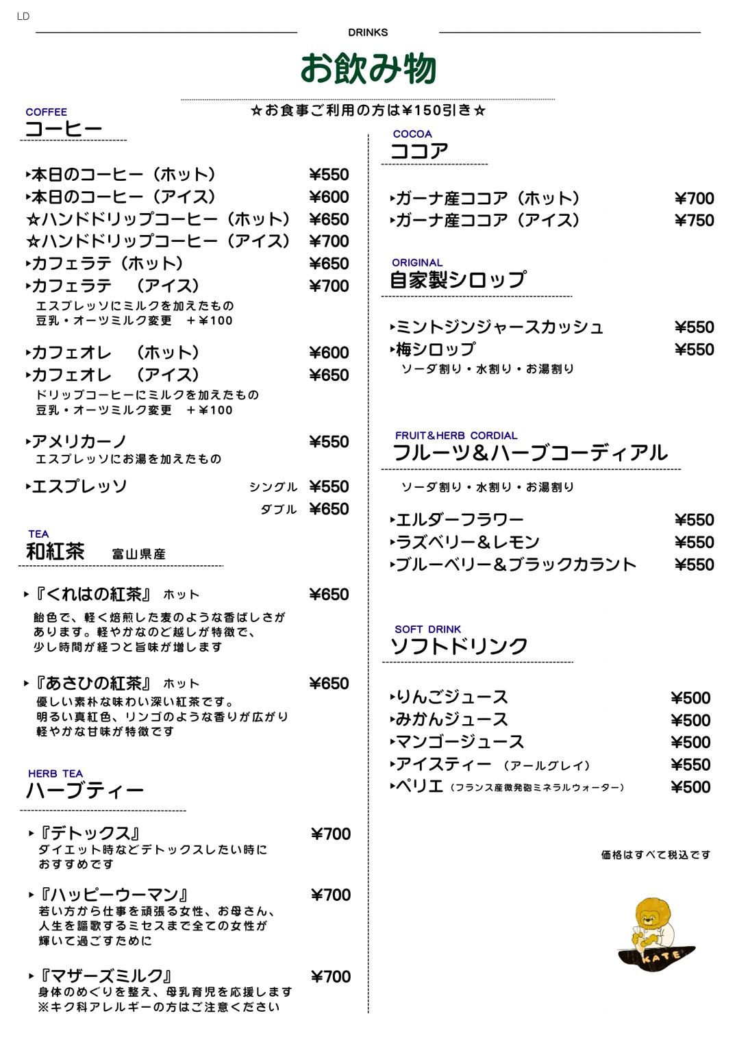 【ランチ・カフェタイムのお知らせ】 1月23日(金)より、ランチタイムの90分の利用制限がなくなります。 ランチのスタートが、11時30分から11時に早くなります。 11時~12時の間のみ、ご予約ができます。 12時以降は、ご来店順にご案内します。 1月18日を持ちましてGUMP COFFEE立山店が閉店致します。 1月23日よりカフェは引き続き、森の茶屋糧が運営いたします。 |